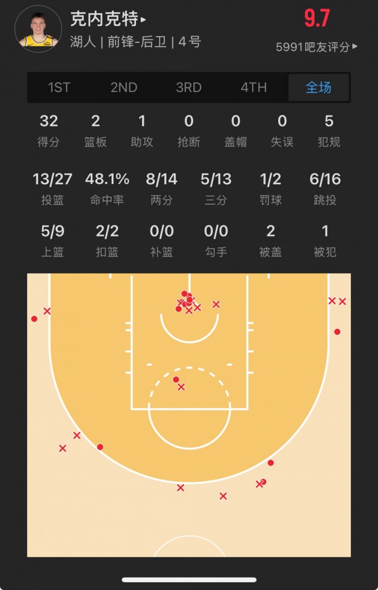 菜鸟丨克内克特27中13砍32分 卡斯尔26分 布朗尼15分钟5中1得5分