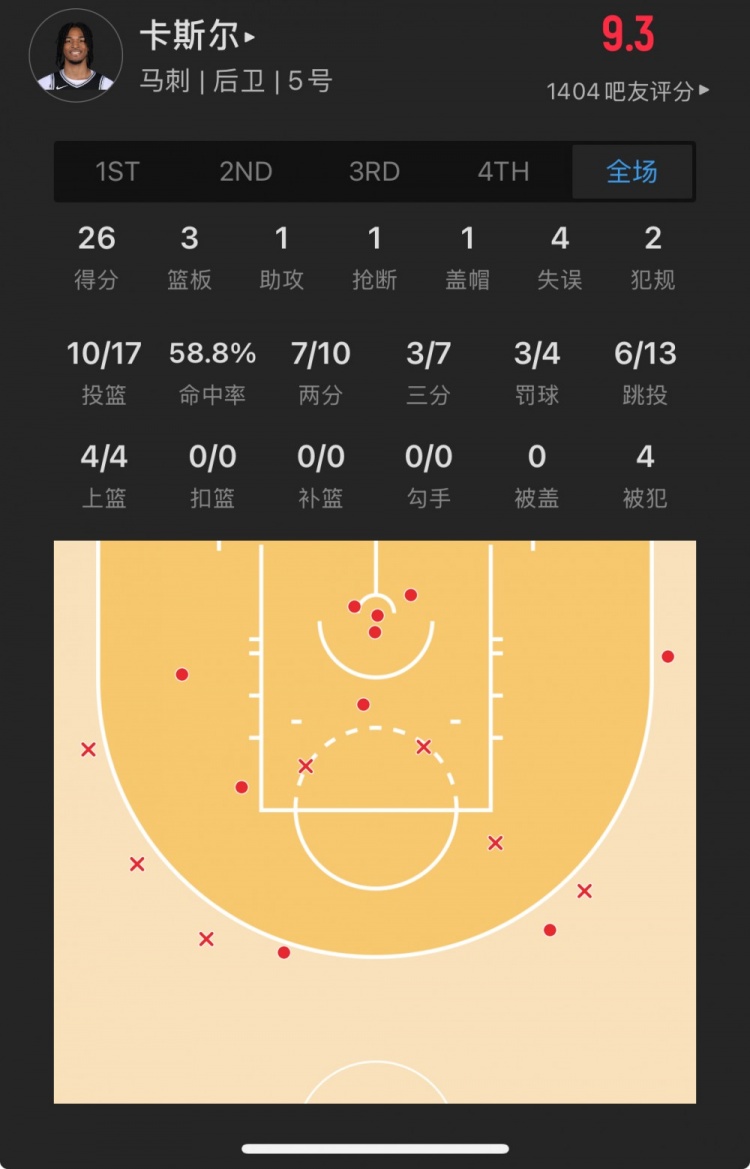 马刺4号秀 斯蒂芬-卡斯尔 登场29.0分钟