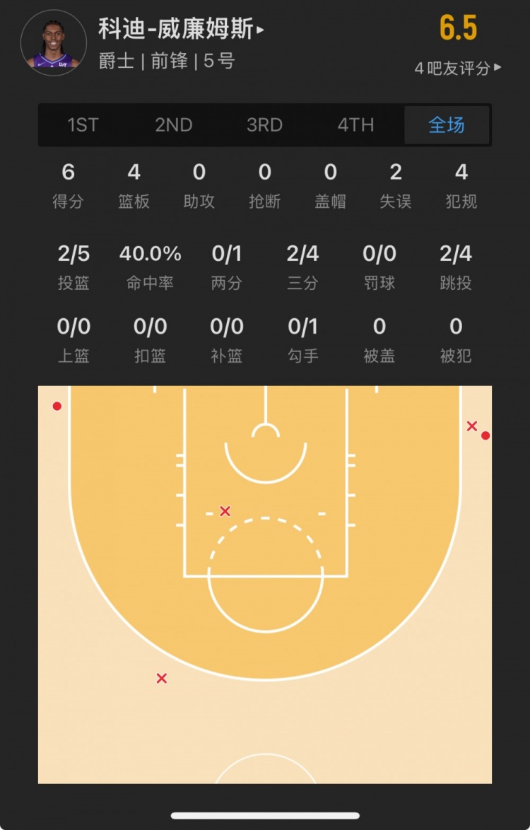 爵士10号秀 科迪-威廉姆斯 登场26.2分钟