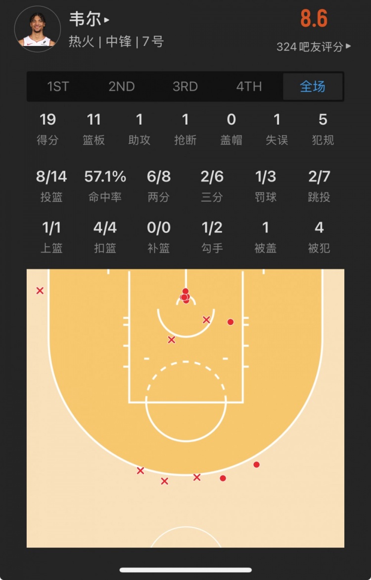 热火15号秀 克雷尔-韦尔 登场35.7分钟