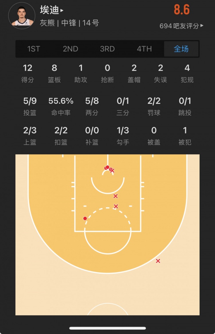 灰熊9号秀 扎克-埃迪 登场27.2分钟