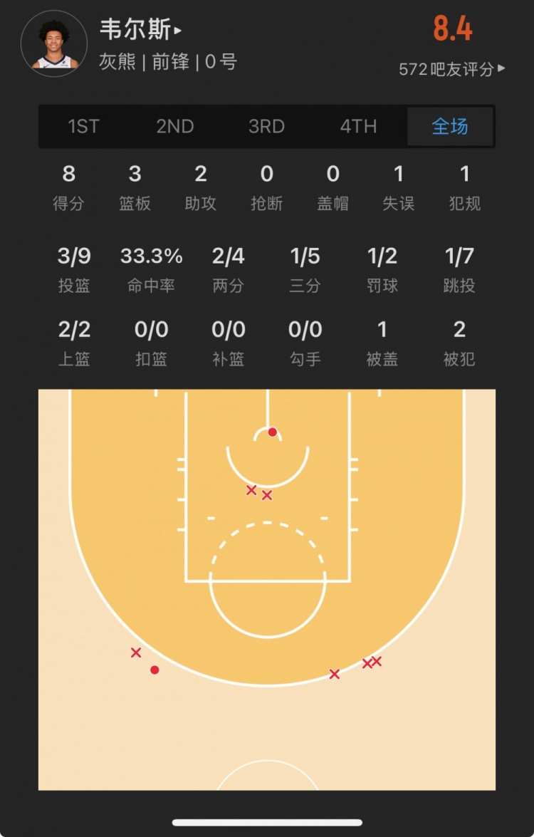 灰熊39号秀 杰伦-韦尔斯 登场26.1分钟