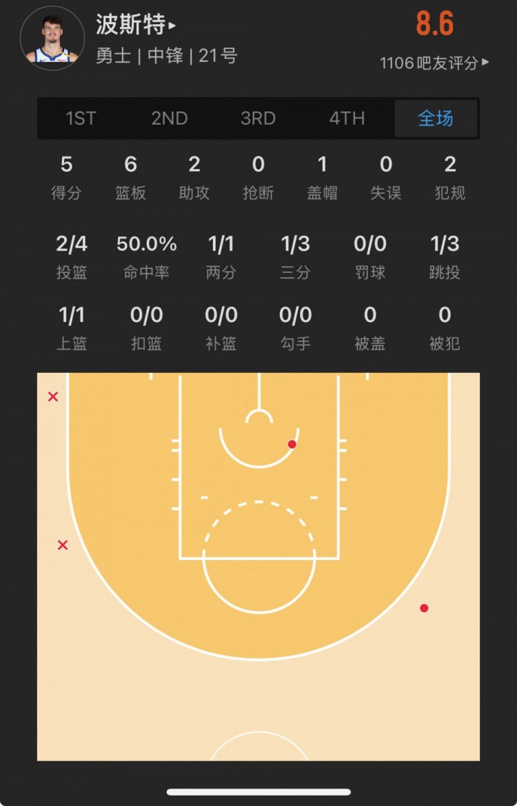 勇士52号秀 昆滕-波斯特 登场19.4分钟