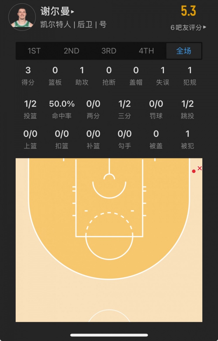 凯尔特人30号秀 贝勒-谢尔曼 登场10.8分钟
