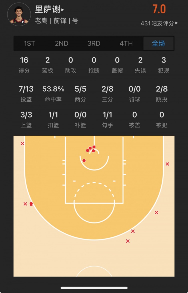 老鹰状元秀 扎卡里-里萨谢 登场22.6分钟