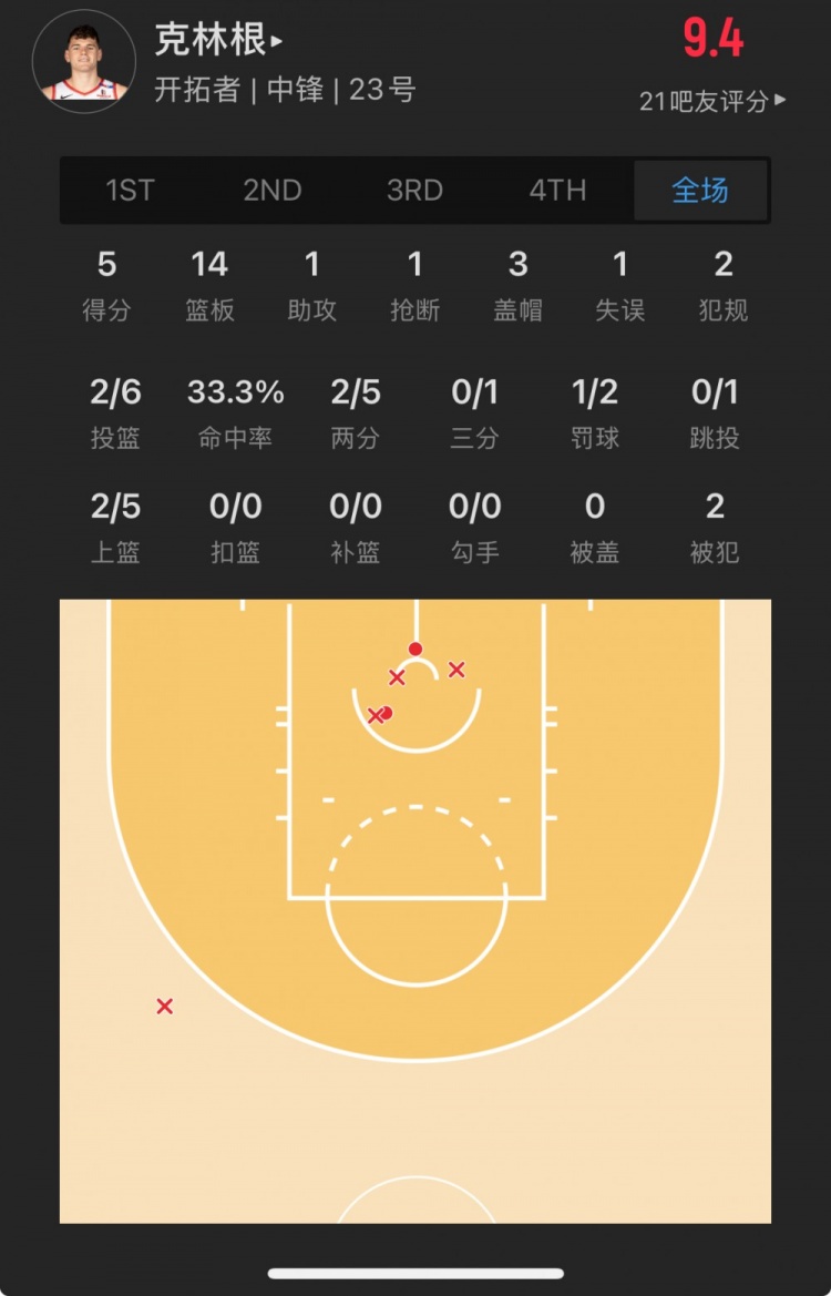 菜鸟丨状元里萨谢13中7得16分 克林根5分14板3帽 科利尔11+6+6