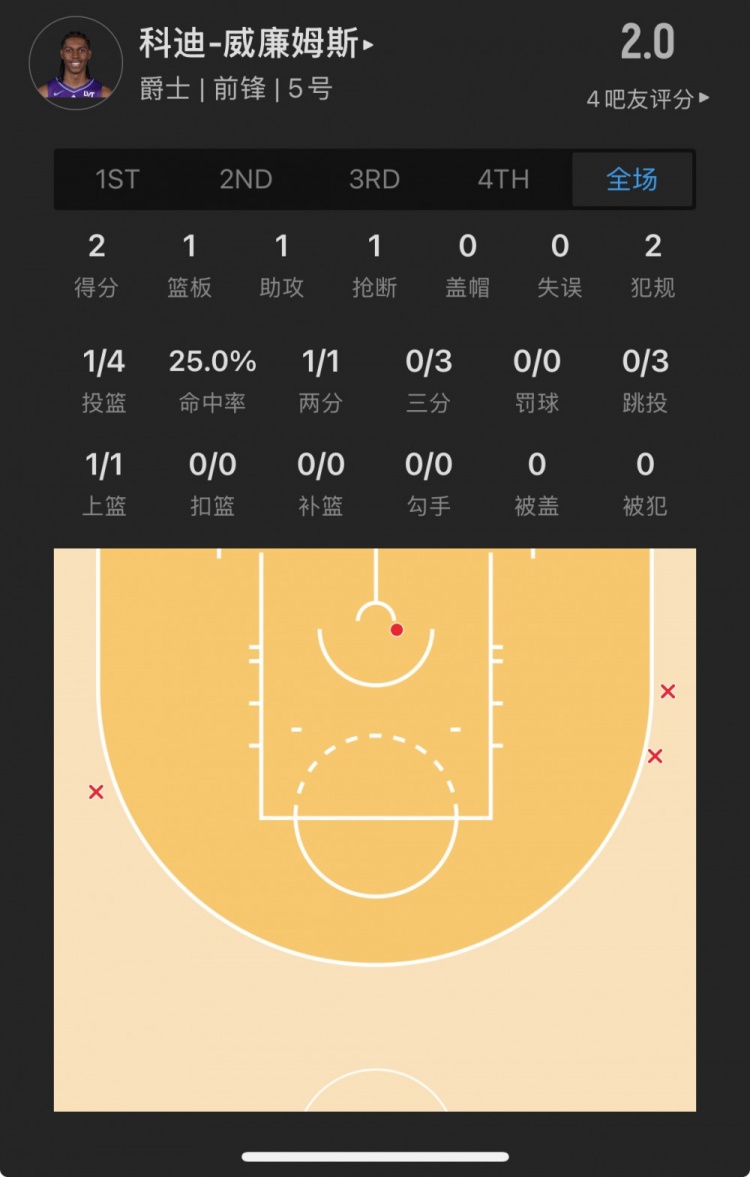 爵士10号秀 科迪-威廉姆斯 登场19.6分钟