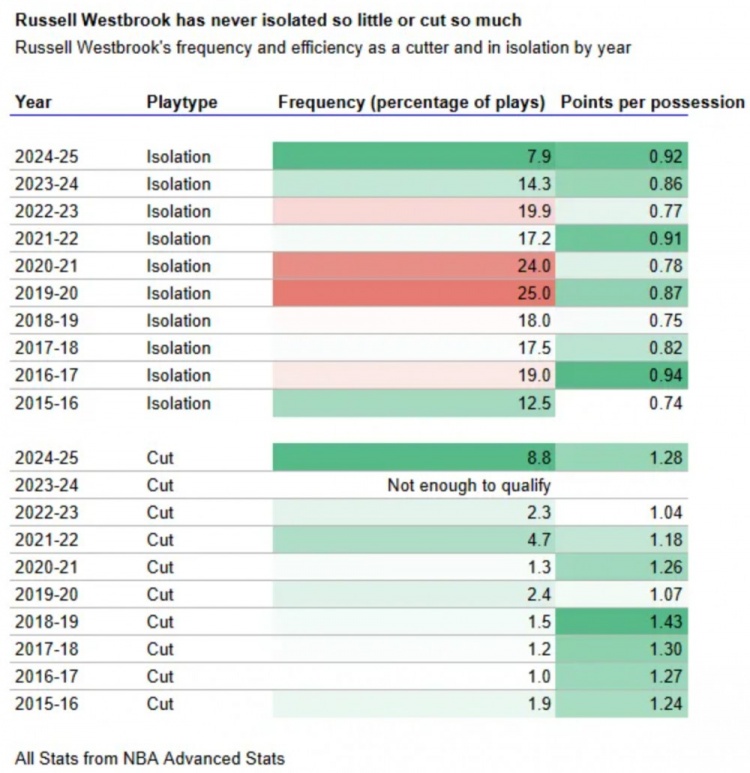 与此同时,威少有8.8%的回合以空切结束,每次空切出手机会能得到1.28分。这一空切频率也远远高于威少职业生涯的其他时期,并且首次超过了他的单打频率(7.9%)。