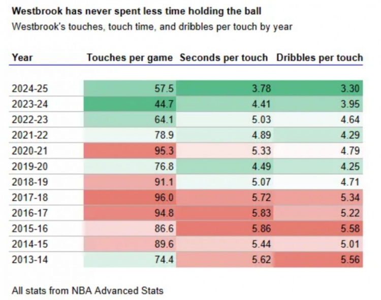 (图为威少十多年来的持球情况:第一列为赛季,第二列为场均触球次数,第三列为每次触球时间,第四列为每次触球运球次数)