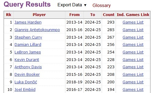 2014年至今联盟球员30+场次数榜:哈登294第一 字母第二 库里第三