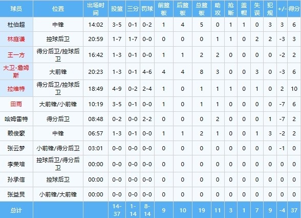 天津全队上半场在三分线外的手感都不理想,全队出手14次三分仅投中1球,其中林庭谦一人三分7投1中。